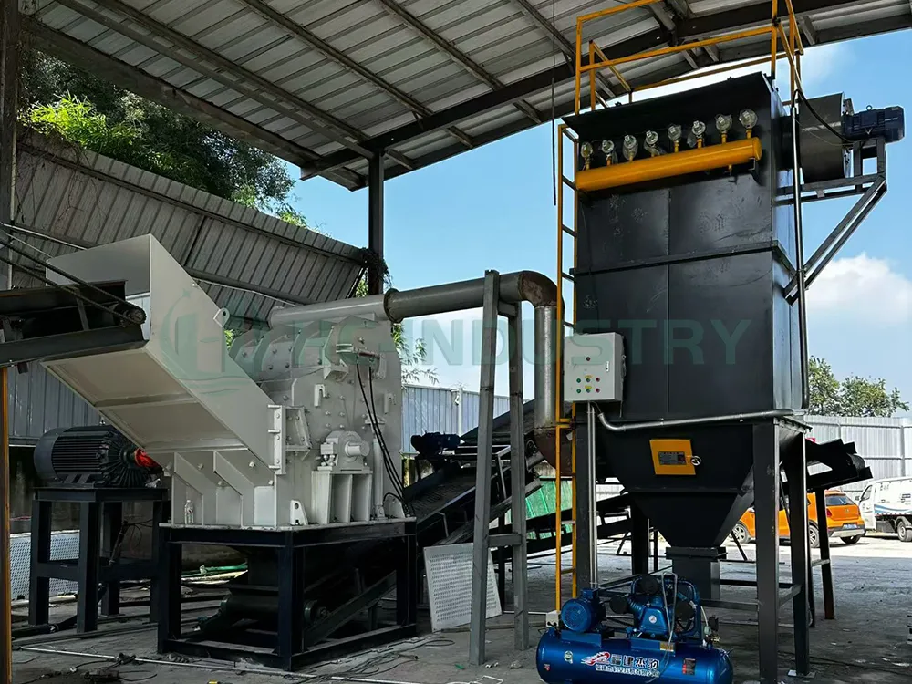 El material se tritura aún más utilizando la trituradora de martillos metálicos, lo que aumenta la eficiencia del proceso de separación posterior.
